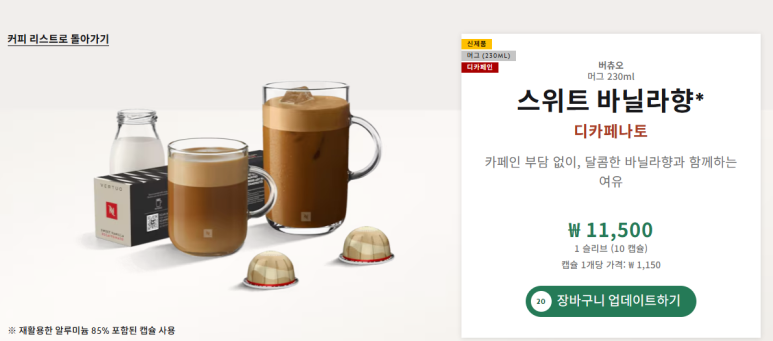 👉네스프레소 스위트 바닐라 디카페나토 바로가기