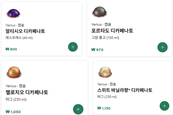 버츄오 전용 디카페인 캡슐은 총 4종이 있다.