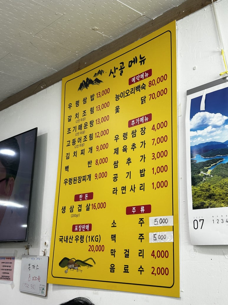 갈치조림, 조기매운탕, 삼겹살, 능이오리백숙 등