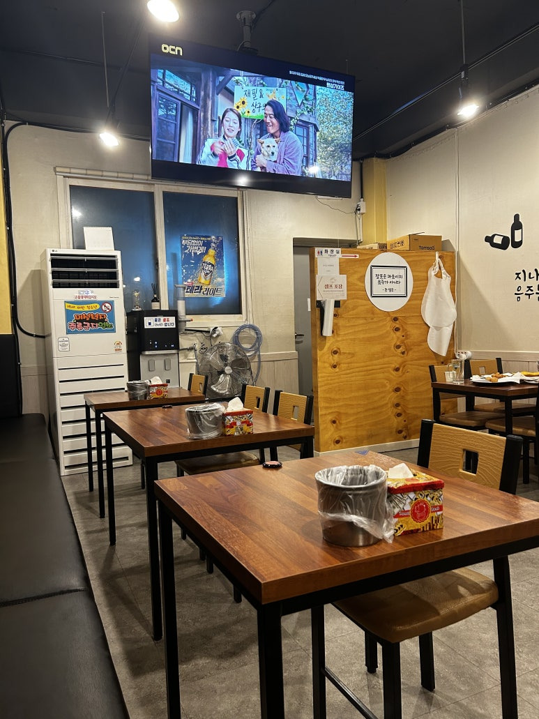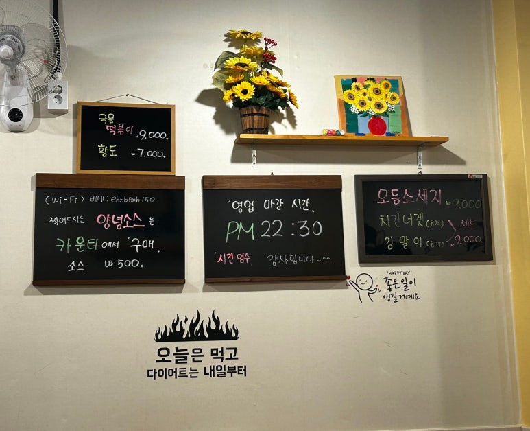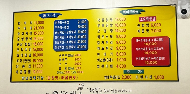 닭발, 오뎅탕, 감자튀김, 라면, 황도 떡볶이 등등