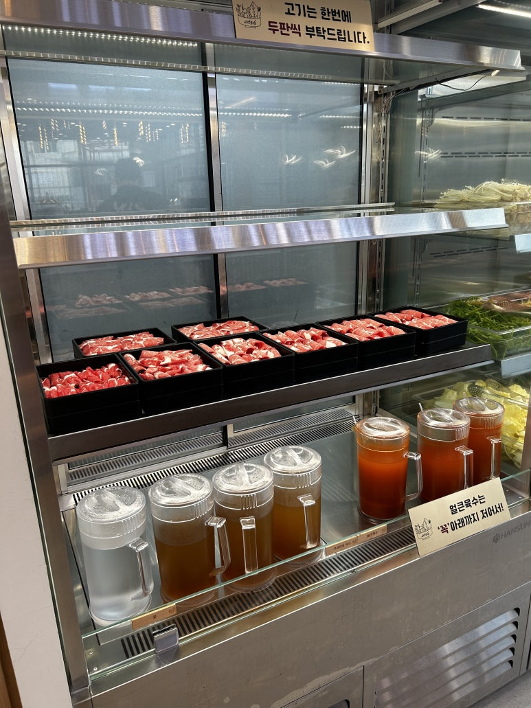 리필해 먹을 수 있는 기본육수 , 얼큰육수가 있고,