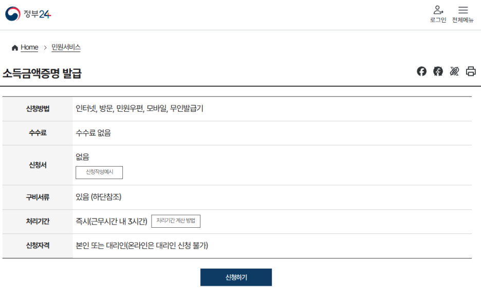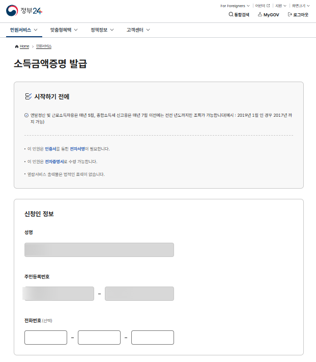 소득금액증명 발급 | 민원안내 및 신청 |정부24