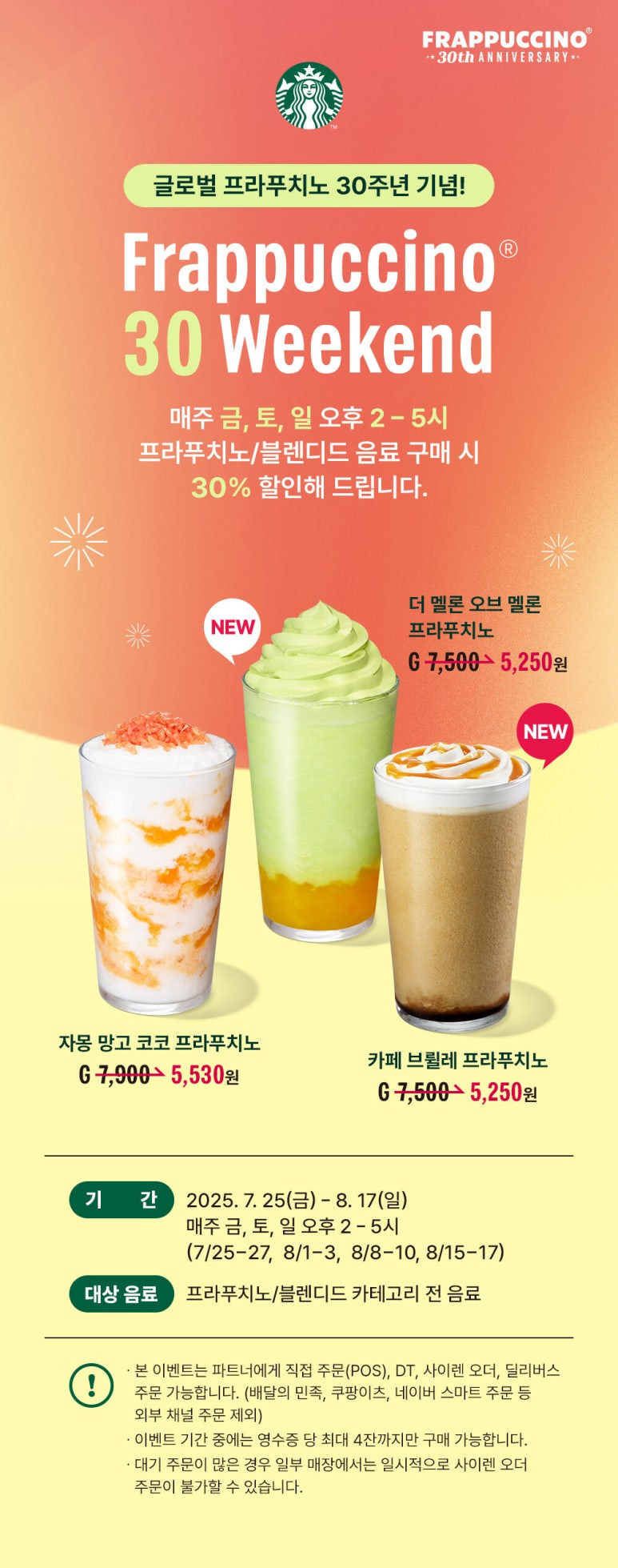 스타벅스 프라푸치노 할인받고 당 충전 완료🍑금,토,일 오후 2~5시 한정 이벤트임산부도 먹을 수 있는'피치 요거트 블렌디드' 후기 차뇨리랑 오랜만에 외출해서 놀다가너~~~~무 더워서근처 스타벅스로 피신했다..마침 방문한 날이 금요일이라스타벅스에서 프라푸치노 할인 이벤트가 진행 중이었다.바로 30% 할인받고 음료 주문!🍹 FEEL THE SUMMER BURST 신메뉴 출시올여름 스타벅스는‘FEEL THE SUMMER BURST’ 콘셉트로신메뉴 음료와 디저트를 선보였다! 제철과일인 멜론을 활용한음료랑 케이크도 있고,차뇨리가 좋아하는 초코크림 소라빵도 있다. 지금 이벤트 중이라 이 음료 4종을할인 받아서 먹을 수 있다🧡 🧊 프라푸치노 30주년 기념 할인 이벤트이번에 스타벅스가프라푸치노 출시 3..