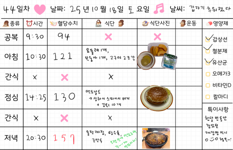 임신 35주차 임당식단 50일차 & 혈당체크 꽈배기, 키위, 붕어빵, 맥도날드 햄버거 25년 10월 24일 금요일50일차 시작🧡✔️ 공복 혈당 '79' 체크인⭕처음보는 혈당수치왜 이렇게 낮지 !!너무 오래 잤나 ~? 🍽️ 아침식사 꽈배기 1개키위 2개​​ ✔️ 아침 식후 1시간 혈당 '143' 체크아웃❌​꽈배기랑 키위 먹었는데 수치아웃ㅎㅎ야채가 없어서 그런가부다 ! 🍽️ 점심식사 어제 먹고 남은 마라샹궈붕어빵​✔️ 점심 식후 1시간 혈당 '146' 체크아웃❌ 병원 진료다녀오니 4시 넘었다너무 배고파서 이것저것 다 챙겨먹음붕어빵 때문에 혈당 튀어버렸다ㅠㅠ 🍽️ 저녁식사맥도날드상하이 스파이시 버거맥너겟스파이시 치킨텐더감자튀김​✔️ 저녁 식후 1시간 혈당 '131' 체크인⭕점심 늦게먹어서9시에 햄..
