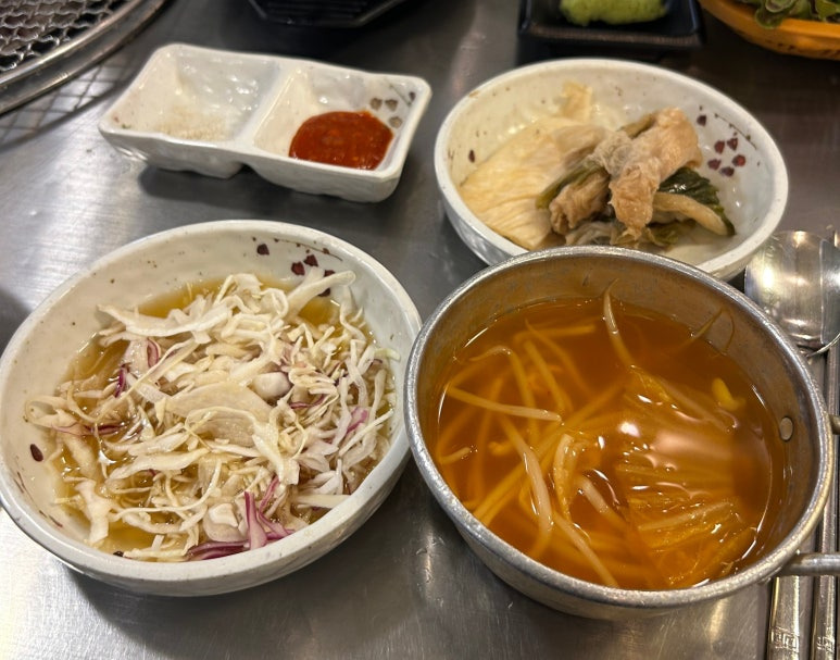 개인 앞에 양배추절임, 콩나물국, 소금, 쌈장